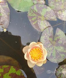 Ninfea nana Chrysanta dai fiori di un colore delicato e sfumato, molto fiorifera e con le foglie striate. Per le sue dimensioni é ottima anche sui balconi in mini pond . Essendo nana bastano 30 cm di acqua in cui sommergerla, per info contattare.