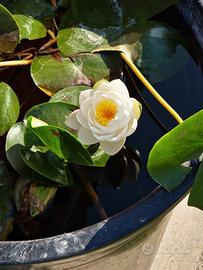 Fiore: Bianco neve con un cuore di stami giallo oro. Il contrasto è vivido e luminoso, perfetto per illuminare angoli d'acqua all'ombra parziale o in pieno sole.