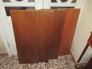 Nr. 4 mensole in legno color noce, il bordo davanti è lavorato, misurano cm 93*34,5*2,5. Qualcuna delle superfici è un pò graffiata. Disponibili, per inutilizzo, altre 12 mensole varie misure, tipologie, epoche, prezzi; 7 specchi diversi tra loro; alcuni articoli per illuminazione vari tipi e prezzi; 1 tappeto in gomma lungo mt 3 circa; 1 cuscino/materassino per sedia sdraio tipo Scab.