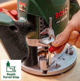 Bosch Fresatrice verticale POF 1400 ACE, 3 pinze di serraggio, fresa, guida parallela, adattatore di aspirazione, valigetta, potenza 1400 Watt.