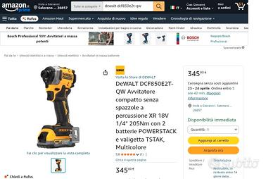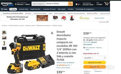 NUOVO Acquistato da Amazon AVVITATORE AD IMPULSI DEWALT DCD850 con 1 Batteria 5Ah 18V XR oppure 1 Batteria POWERSTAK La vendita include: 1 AVVITATORE dcd850 18V BRUSHLESS 2 BATTERIA 2AH 18V XR 2025 oppure 5Ah oppure Batterie Powerstack con led di stato carica a spegnimento a tempo. Corredato di Gancio per cintura in acciaio e supporto magnetico per gli inseriti. -------------------------------------- Caricabatteria rapido e valigetta su richiesta. ULTIMA GENERAZIONE DEWALT COMPATTO E POTENTE. ------------------------------ Contatto WhatsApp 3803497777 ------------------------------- CARATTERISTICHE: 3 luci LED ad anello per un illuminazione uniforme senza ombre 3 Modalit e velocit di utilizza compreso Precision Drive Motore brushless compatto Il più piccolo e potente avvitatore ad impulsi 18V XR offre maggior comfort e velocit di applicazione. Offre 206Nm in un corpo compatto di 10cm di lunghezza perfetto per tutte quelle applicazioni in spazi ristretti. 3 modalità d'uso per un maggiore controllo, tra cui Precision Drive che impedisce che il materiale e l'elemento di fissaggio vengano danneggiati e 3 luci luce LED ad anello per offrire la migliore visibilit negli ambienti piú difficili senza ombre. Compatibile con tutte le batterie DEWALT 18V XR,POWERSTAK e 54V FlexVolt Il potente motore Brushless garantisce una potenza di 206Nm di coppia con velocità di 3250 Impulsi/min per completare velocemente le applicazioni di fissaggio. Per i Moderatori di Subito.it, Il venditore dichiara che i beni in oggetto del presente annuncio sono originali.