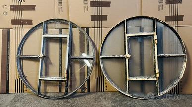 In vendita due oblò, con diametro 70cm, uno con vetri trasparenti e l’altro con cetro satinato, con antina apribile, nevessitano di restauro, sostanzialmente cambiare il mastice.