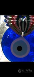 Amuleto turco chiamato Occhio di Allah oppure Occhio Turco. È realizzato in vetro con una lavorazione in macramè.