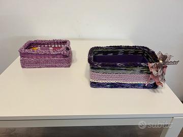 Oggetti come cestini, custodie, borse, scatole, di diverse dimensioni, tutti interamente rivestiti in lana di diverso colore ed intreccio; anche il retro della scatola o del cestino è rivestito, in lana o in tessuti quali foulard, avanzi di sciarpe, magliette in lycra leggere. A seconda delle dimensioni o degli abbellimenti come nastri, pon pon, fiocchi, la realizzazione di ciascun oggetto, richiede dalle 3 ore in su. Alcuni degli oggetti hanno le maniglie per essere trasportati dove necessario e per contenere il materiale desiderato: i gomitoli di lana, le chiavi da depositare all’ingresso, la cesta per il riposo del gatto, le riviste da tenere in bagno, qualche contenitore per mettere dei prodotti alimentari da regalare a Natale. Gli oggetti in foto sono solo degli esempi. Disponibilità per ordini su misura, filato, colore e dimensioni personalizzati. Secondo me sono stati fatti molto bene da mia mamma guardando dei tutorial.