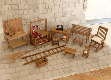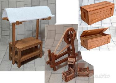 Il Natale si avvicina! Per preparare il presepe, realizziamo, su richiesta, vari oggetti in legno, fatti a mano singolarmente, molto dettagliati e rifiniti. Nulla di pronto, solo su richiesta. Le immagini rappresentano oggetti di varie misure a seconda delle dimensioni dei personaggi e/o luoghi. Per esempio una sedia in legno e corda piccola ha la dimensione della moneta da 1 euro e si adatta per proporzioni a personaggi da 6 cm. A disposizione per informazioni.