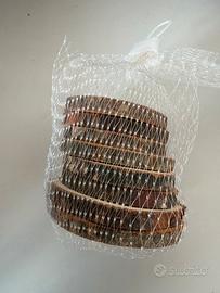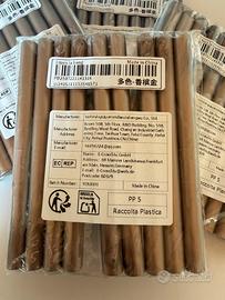 Vendo per inutilizzo i seguenti allestimenti per matrimonio: - 150 coni riso in tre confezioni lunghezza 20 cm diametro 8 cm (una confezione é aperta per la visione dei coni) 35€ - 4 pacchetti di bastoncini di ceralacca colore oro champagne per pistola colla a caldo (una confezione presenta un bastoncino in meno in quanto utilizzato) 14€ - 7 tronchetti decorativi per segnaposto 2€ - 8 tronchi piani decorativo per segnaposto diametro 6 cm 2€ Vendo anche separatamente gli allestimenti, se acquisto in blocco 50 euro tutto.
