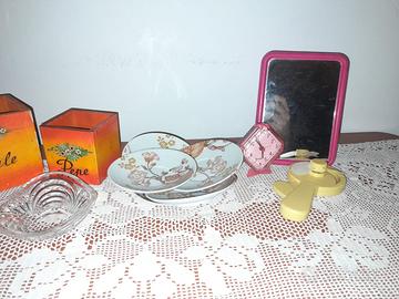 Il kit di oggettistica è nuovo, in vendita perché è stato un regalo mai utilizzato. Il kit contiene: A) 2 Portapiante vintage in legno con raffigurati sale e pepe. I due recipienti in legno sono vintage e adatti come portapiante oppure sopra tavola: il tema è il sale e il pepe esaltati dal color arancione sfumato giallo del fondo. I recipienti sono in legno compensato verniciati. Può essere usato come portafiori, centrotavola o vaso d’arredo. Essi ha le seguenti dimensioni: il più grande altezza 10 cm, larghezza 10 cm e lunghezza 10 cm; mentre il più piccolo altezza 8 cm, larghezza 8 cm e lunghezza 8 cm. B) Gli 6 piattini da caffè con la fascia di decorazione geometrica sono in ceramica, facilmente lavabili in lavastoviglie e sempre brillanti. D) Mentre i 5 piattini da caffè a decorazione floreale sono in ceramica. I piattini sono nuovi, in vendita per mancato utilizzo ed hanno un diametro di 12 cm e altezza 1 cm. E) Il portachiavi in vetro è nuovo, mai utilizzato e senza strisci. Esso è in vetro con la bordura superiore liscia e ondulata. Inoltre, ha delle onde interne per abbellirlo ed è maneggevole e leggero. Può essere utilizzato come portachiavi o ciotola portaoggetti ed ha le seguenti dimensioni: altezza 3,5 cm e diametro 11 cm. E) Lo Specchio da trucco o da viaggio è ottimo per qualsiasi occasione e date le sue misure, può essere portato in valigia facilmente ma anche tenuto in camera grazie al piedestallo. La copertura è in plastica color rosa ed ha le seguenti dimensioni: altezza 18 cm e larghezza 13cm. F) Il Ventilatore manuale è ottimo nelle estati torride per una rinfrescata veloce: muovendo la manovella le pale ruotano e danno un po’ di freschezza. Il ventilatore ha una lunghezza di 15 cm. G) In conclusione, la sveglia da garage o da comodino è perfettamente nuova senza strisci e crepi. Ha la particolare forma di un quadrato ma inclinata à 45 gradi. Essa ha le seguenti dimensioni: altezza 9 cm, lunghezza 7,5 cm e profondità 5 cm. Il costo totale 10€