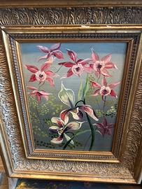Olio su compensato raffigurante delle orchidee, con cornice dorata lavorata. Altezza 42e mezzo larghezza35cm. ritiro a carico dell’acquirente zona Corso Svizzera/Parco dora