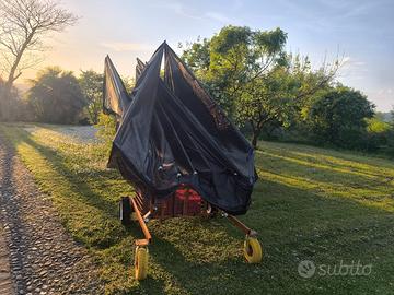 Ombrello motorizzato agevolatore raccolta frutta e olive, noci, pistacchi, mele, ciliegie, arance, limoni etc. L'ho costruito per muoversi agevolmente in terreni collinari con pendenza tramite motori; è telecomandato a distanza. Un sistema motorizzato permette all'ombrello di basculare in avanti e indietro per adattarsi a qualsiasi pendenza. Il raggio dell'ombrello è di circa 8-9 metri, ma ho disponibilità di teli anche da 5, 6, 7 metri di diametro. Il carrello automatico ha 5 velocità di movimento e va dai 2 ai 6 Km/orari. Può trasportare inoltre, anche in salita le batterie per gli abbacchiatori o un piccolo gruppo compressore per quelli ad aria. trasporta 2 cassette dove cadranno e verranno raccolte le olive dopo l'abbacchiatura. Le cassette possono contenere 25 kg di frutta ciascuna. Il progetto è un prototipo costruito da me, per me, in quanto sono un Ing. tecnico superiore in meccatronica e automazione industriale possessore di ulivi ed alberi da frutto. Vendo per immediato realizzo e poter portare fondi a nuovi progetti di automazione agricola. Sto attualmente implementando la chiusura dei bracci in maniera automatica senza l'intervento di un operatore che lo faccia manualmente; sarà a breve disponibile, soprattutto se richiesta. Il carrello si muove molto bene tra i campi ed i filari, ed è in grado di semplificare e velocizzare enormemente il lavoro, in rapporto a quello necessario per stendere le reti. Quindi riduce il lavoro in autonomia a soli 2 operatori, massimo 3 per pianta impianto. Previsto il ritiro in loco, con test funzionalità. O possiamo prendere accordi per una consegna fatta da me al costo dell'uscita in trasferta. Sono a disposizione per ogni domanda chiarimento o delucidazione tecnica nelle ore pomeridiane / serali.