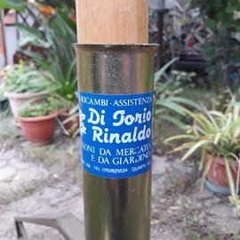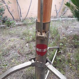 Ombrello per mercato / giardino di forma rettangolare con tripiede e custodia. Altezza m 2,70 Lunghezza m 3,80 Larghezza m 2,40 Larghezza tripiede cm 72 Altezza totale esterna m 2,80 Ottime condizioni generali, sono presenti tre piccole fori dovuti a bruciature di cicche di sigaretta, facilmente riparabili. Ritiro presso Flumini di Quartu.
