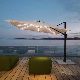 L’ombrellone Ibiza è il tocco che mancava per trasformare il tuo spazio esterno in una vera oasi di relax e stile. Con la sua struttura laterale in alluminio, il sistema di rotazione a 360° con pedale e l’apertura fluida tramite maniglia e manovella, ti offre tutta la flessibilità che serve per inseguire l’ombra in ogni momento della giornata. Le luci LED integrate a energia solare accendono la sera con un’atmosfera intima e suggestiva, perfetta per cene all’aperto o serate in compagnia. Una volta cariche, illuminano fino a 4 ore, senza fili, senza pensieri. Il telo in poliestere idrorepellente ti garantisce resistenza e una protezione efficaci, anche nelle giornate più calde.
