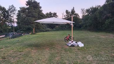 Ombrellone a palo laterale L 282 x P 391 x H 274 colpr crema. Dotato di strisce led che si accendono con un pulsante. 4 contenitori per acqua che lo tengono fermo a terra. Maniglia di apertira e chiusura facilitata, regolazione inclinamento laterale.