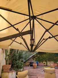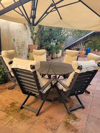ombrellone con tavolo rotondo e sei poltrone complete di cuscini sia seduta che schienale. la lega è di un alluminio particolarmente trattato per l'esposizione agli agenti atmosferici. la spedizione è da concordare nei modi e nel costo