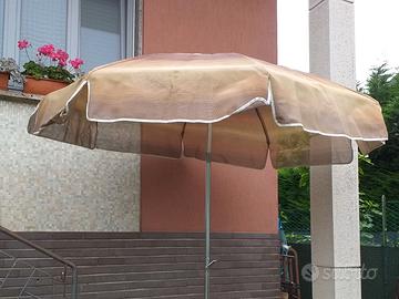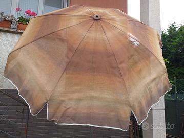 Ombrellone con base in ferro, apertura a manovella con due livelli di inclinazione, traforato, diametro circa 2 m, con fodero