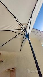 Ombrellone da appoggio a parete in perfette condizioni , completo di base decorata , copre perfettamente un balconcino di piccole dimensioni oppure può essere utilizzato come riparo di una portafinestra assolata proprio per la sua caratteristica a mezzaluna che gli consente di essere appoggiato al muro . Non faccio spedizioni, ritiro a mano