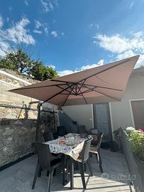 Bellissimo ombrellone da esterno, ideale per il giardino o terrazzo. Struttura in metallo, colore beige. Perfetto per proteggersi dal sole nelle giornate più calde. Manca solo la piantana, l'ombrellone è girevole, e la consegna è presso il venditore. - Misure: 3x3 metri circa - Colore: Beige - Materiale: Metallo e tessuto