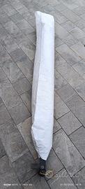 Ombrellone da giardino 3x3 , con braccio laterale decentrato, struttura in legno ,telo in poliestere colore bianco, base ancoraggio a terra in ferro con mattonelle in cemento incluse.stato vedi foto, telo con segni di usura.Trasporto Escluso.