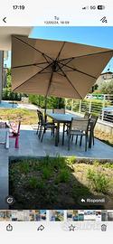 Ombrellone da giardino a palo decentrato OBI colore moka. Acquistato giugno 2024 e utilizzato per 2 estati. Ora non piu usato per installazione pergola. Gia smontato. In vendita con 4 piastrelle da usare come pesi. 3 metri x 3 metri. Piccolo difetto di un pezzo di plastica rotto ma non inficia funzionamento.