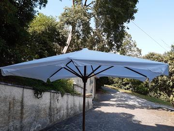 ombrellone con struttura in legno e tela in cotonaccio color beige, con base circolare in pietra, perfetto per uso in terrazza o giardino, come nuovo, usato pochissimo