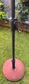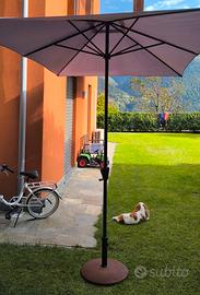 Ombrellone da giardino composto da basamento in cemento molto pesante color mattone, pali in acciaio inossidabile termolaccati come la sottostruttura e parasole in tessuto colore tortora.