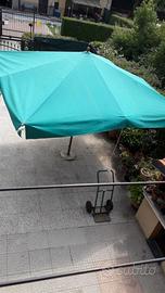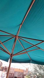 Con meccanismo di apertura manuale a corda con carrucola. Adatti all`uso professionale, per dehors e giardino. Il telo è di colore verde, 100% acrilico, sostenuto da stecche in legno intercambiabili, è antimacchia, idrorepellente e traspirante. Struttura a palo centrale in legno. Pagato 680 euro. Le misure del telo sono di 4 metri x 4 metri, la misura del supporto a terra è di circa 40 cm x 40 cm.
