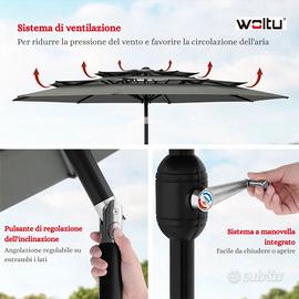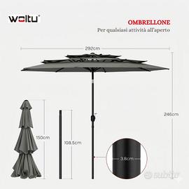 Disponibili ombrelloni da esterno marca Woltu, perfetto per giardino, terrazzo o bordo piscina. L'ombrellone non è solo un elemento d'arredo elegante, ma è progettato per durare nel tempo grazie ai materiali di prima scelta. Spedizione GRATUITA Materiale: 🧩Tessuto in fibra di poliestere di alta qualità, resistente e duraturo. Protezione Totale: ☔ Tessuto idrorepellente (resiste alla pioggia) e con protezione solare certificata. Design Traspirante: ⛱️ Struttura a doppio livello che permette il passaggio dell'aria, garantendo freschezza e maggiore stabilità contro il vento. Durevolezza: 🎨 Colore resistente ai raggi UV che non sbiadisce con il tempo.. Disponibile per qualsiasi info.
