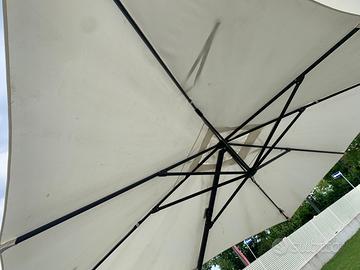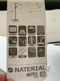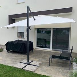 Vendo Ombrellone decentrato, forma rettangolare, con palo laterale in colore antracite. Telo di colore bianco con trattamento di protezione anti raggi UV. Apertura/chiusura manuale tramite manovella laterale. L'ombrellone viene fornito con una base già riempita con 4 pezzi di granito (compresi nel prezzo). Misure: 281 x 386 cm (larghezza x profondità). Altezza massima: 275 cm.