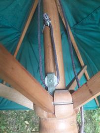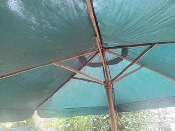 Ombrellone da giardino vintage con palo e struttura in legno a 6 braccetti e telo in poliestere di colore verde. Palo centrale smontabile in due parti del diametro di cm 5..Con meccanismo a carrucola per facilitarne l'apertura, regolabile in 3 posizioni di altezza. . Dimensioni diametro mt 3, altezza mt 2. Venduto senza base. Con confezione originale delle dimensioni di cm 15 x 15 x lungh 153 e del peso totale di kg 9. Pagamento diretto con bonifico.