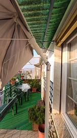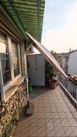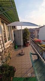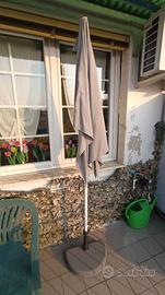Ombrellone da terrazzo o giardino da posizionare vicino a muro o ringhiera. Larghezza 150 prof.100 inclinabile con basamento in pietra. Tessuto da esterno grigio smontabile e lavabile.