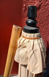 Ombrellone e 3 Piedi BAMBÙ Etnico floreale carta riso composto - SUPPORTO per ombrellone dal design etnico, realizzato in bambù con una base a tre piedi e diametro di occupazione a terra di 84 cm; con cilindro di scorrimento interno per asta alto 70cm; base chiudibile in borsa da trasporto con tracolla: la struttura integra in bambù e viti di tenura, apertura e incastro sicurezza. - OMBRELLONE con dettagli decorativi colorati disegnati stile floreale su carta da riso giapponese Wagasa; ha una circonferenza di +3.5 m, lesionato su un lato (foto) ma protetto-bloccato da nastro chiaro; con asta prolungamento fino a 2.50 cm utilizzando apposita asta separata in 3 piedi; e borsa beige da trasporto. POSSIBILE in chat chiedere eventuale vendita di una delle due componenti al 50% del prezzo esposto. Il peso della composizione intera supera i 23 kg.