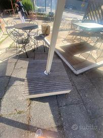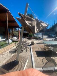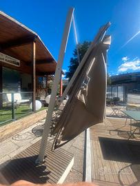 Ombrellone con palo laterale come in foto, dimensioni m.3x3, orientabile, girevole a 360°, retrattile, tessuto acrilico, base con ruote e piano in tek, marca Ombrosa, modello extra lusso, nuovo con fodero, in esposizione presso Progetto Esterno, viale della Croce Rossa 115, L'Aquila. Prezzo di listino €6.500, prezzo di vendita €3.300 affarone!