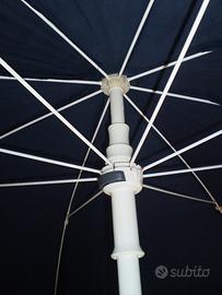 DESCRIZIONE: ombrellone parasole rotondo colore blu notte e struttura in alluminio bianco a 8 stecche curve; la tela 100% acrilico, ripara all'85% dai raggi solari; NON è inclinabile ma fisso; pulsante chiusura e rotella fissa prolunga manico in plastica; ogni stecca è ulteriormente tenuta fissa da fascette in velcro; made in Italy; usato poco e ben tenuto (protetto anche durante l'inverno); (l'azienda Hoyland Fox® è un eccellente produttrice di ombrelli, fatevi ricerca in internet); le foto rispecchiano la realtà del prodotto
