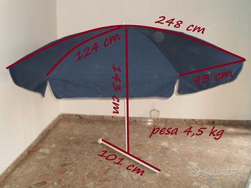 MISURE: asta: bassa rimovibile 101cm, alta fissa 143cm, totale asta 244cm; ombrello: raggio 124cm, diametro 248cm, ampiezza maggiore da raggio a raggio 93cm; pesa 4,5kg; vedere anche le foto