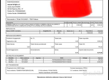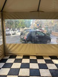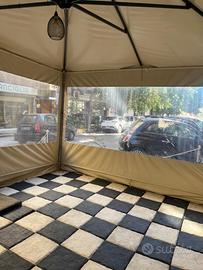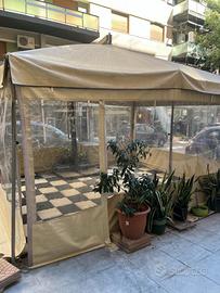 Vendo Ombrellone in alluminio di 5x4 m con struttura e base in ferro e coperture laterali in PVC con paletti. Offre una adeguata copertura per circa 15 - 20 coperti e consente di ampliare le superficie di servizio ricorrendo ad una pavimentazione decorativa in PVC come nella foto. Grazie alle coperture laterali consente un utilizzò tutto l’anno e perciò si ammortizza in poco tempo