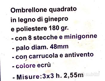 Vendo ombrellone quadrato in legno di ginepro nuovo sigillato in scatola originale mai usato Colore beige Misura 3 X 3 h 2,55 m