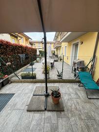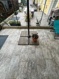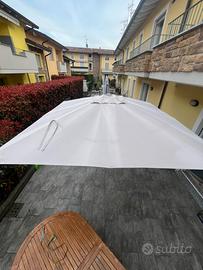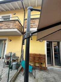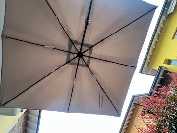 Vendo ombrellone richiudibile con palo laterale, come da foto. L’ombrellone è orientabile sia per inclinazione e posizioni laterali. Misure circa 3 m per 3 m Regalo mattonelle per la base dell’ ombrellone