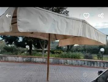 ombrellone in palo di legno con base in ferro . presenta dei piccoli tagli ma è ottimamente funzionante