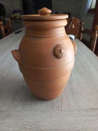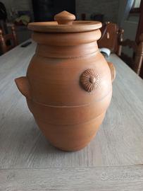 Vendo bellissimo orcio in terracotta naturale,lavoro artigianale con decorazione a rilievo e coperchio originale.Perfetto come componente d'arredo in stile rustico,mediterraneo, Shabby. Misura 30 cm. di altezza circonferenza "pancia " 61 cm. in ottime condizioni nessuna crepa o sbeccatura, interno perfetto.