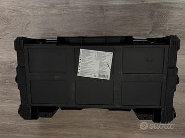 Robusto organizer da lavoro in plastica rigida con manico in metallo e chiusure laterali in acciaio.