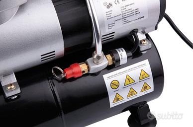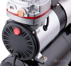 Compressore per aerografo oil-free e Bicilindrico, regolatore di pressione con manometro, sifone e filtro aria, valvola di sicurezza limitatrice di pressione, protezione contro il surriscaldamento