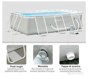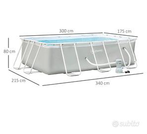Outsunny Piscina Fuori Terra Rettangolare da Giardino con Pompa di Filtraggio e Telaio in Acciaio, 340x215x80cm, Grigia, completamente NUOVA, ancora imballata. Ideale per chi vuole rinfrescarsi in giardino durante l’estate con amici e famiglia! ✅ Struttura in acciaio resistente alla ruggine ✅ Rivestimento in PVC a 3 strati, durevole e anti-perforazione ✅ Piedi larghi per massima stabilità ✅ Morsetto per fissare il tubo ed evitare perdite ✅ Tappo di scarico per svuotamento facile ✅ Montaggio semplice e veloce, senza attrezzi ✅ Pompa filtro inclusa per mantenere l’acqua pulita 📏 Dimensioni piscina: •Lunghezza interna: 300 cm •Larghezza interna: 175 cm •Altezza: 80 cm •Ingombro complessivo con struttura: 340x215 cm 📦 Condizione: nuova, mai aperta, confezione originale