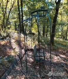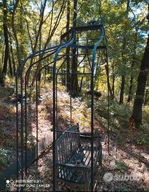 Vendo padiglione (gazebo) CELIN (azienda GAIA di Siena) semicircolare da giardino (250x160x300H),in ottime condizioni,struttura robusta e stabile, realizzata in tubolare zincato con finitura colore grafite, con base (LA 250 x 160), 5 elementi (tralicci H240 x LA 45) e cupola terminale in ferro forgiato con puntale (LA 110 x H 60), 100 kg circa... Elemento di supporto per piante rampicanti, si possono applicare tende ecc.. molto elegante, oggetto raro, in stile francese.. ottimo come punto focale in giardino.. in OMAGGIO rotolo di stoffa in cotone colore avorio per tende da applicare al padiglione... Già smontato.. viste le dimensioni concordare per la spedizione