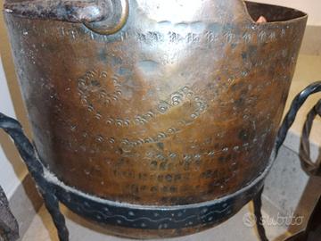 Antico paiolo in rame con lavorazione a sbalzo, completo di treppiede in ferro battuto.