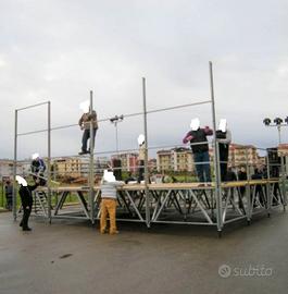 Palco Professionale modulare robusto e versatile, è la giusta soluzione per creare rapidamente spazi per spettacoli, eventi, gruppi musicali. La struttura portante rinforzata in ferro provvista di trattamento di protezione superficiale mediante zincatura. Il palco misura mt. 8 x 6 x mt.1 di altezza, costituito di 12 elementi di metri 2 x 2 x 1 hl. Il piano di calpestio è realizzato in legno lamellare 0,50 x 200 x 25 mm. di spessore. Completo di: Scala. Parapetto su tre lati (appositamente testato per resistere ad una spinta orizzontale). Struttura posteriore hl mt. 3.00 (dal piano calpestio) x 8 mt. di lunghezza per posizionamento di un eventuale cartellone pubblicitario. Contenitori per lo stoccaggio per la movimentazione della struttura, appositamente realizzati per ottimizzare il trasporto. Il montaggio è semplice e rapido, grazie alla struttura prefabbricata appositamente progettata per essere assemblata velocemente ad incastro e senza utilizzo di bulloni. La regolazione in altezza delle gambe permette una grande adattabilità alle diverse situazioni, mentre la struttura modulare in ogni direzione permette di allestire ogni volta il Palco Modulare con la configurazione che meglio soddisfa le esigenze di un evento o di uno spettacolo. Il palco ha il certificato di collaudo aggiornato e conforme alle nuove Norme Tecniche sulle Costruzioni come richiesto dalla legge vigente. Questo importante requisito, garantisce la massima sicurezza nel suo impiego ed evita spiacevoli inconvenienti dovuti all’utilizzo di strutture non a norma. Il palco è usato ma ancora in buone condizioni. Ritiro sul posto