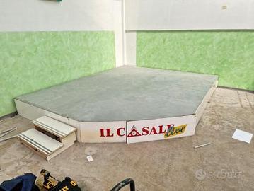 palco per concerti usato, si tratta di un rialzo fonoassorbente composto da 10 moduli 100X200cm h47cm circa (due pezzi riportano una curva), coperti da linoleum anti scivolo abbastanza consumato. i moduli sono in panforte con finitura laccata bianca e all'interno hanno sacchi di juta pieni di stoffa.