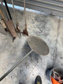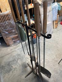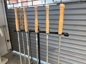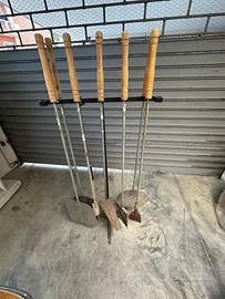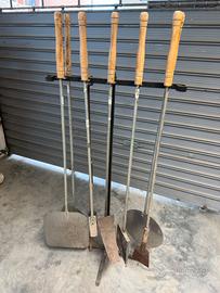 Set per forno a legna composto da: n.1 Pala per pizza quadrata in acciaio inox diametro 35 n.1 Pala per pizza tonda in acciaio inox diametro 30 n.1 Pala per pizza tonda in acciaio inox diametro 20 n.1 Pala n.1 raccogli carbone n.1 spazzola n.1 uncino n.1 spatola lunghezza bracci 170cm con manici in legno completa di sostegno in ferro battuto. Prezzo non trattabile, non spedisco, consegna a mano ritiro di persona