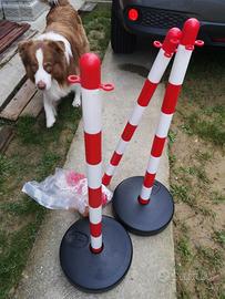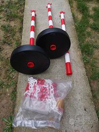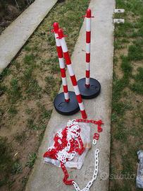 3 paletti plastica segnaletici H. 85 cm, 2 basi plastica tonde d. 30 cm, 7 m catena plstica rossa e bianca, 3 anelli giunzione. Tutto nuovo, residuo di magazzino da cessata attività di vendita.