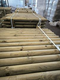Prodotto: Pali in legno di pino massello trattati in autoclave, certificati FSC, ideali per uso esterno.