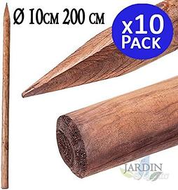 Confezione da 10 Tutor con lunghezza 200 cm, Ø 410 cm. Tutor in legno di ulivo con punta. Si tratta di un tutor per alberi di grande forza consigliato per colture in cui lo sviluppo del legno è rapido e vigoroso, come possono essere mandorli, alberi di legno o anche quando l'albero ha già pochi anni. È un tutor in legno trattato in autoclave, che consente di introdurre all'interno del legno il trattamento anti marciume e contro funghi e insetti, con più efficacia e durata, rispetto ai trattamenti convenzionali.
