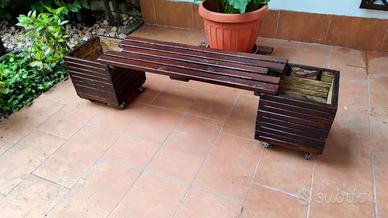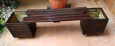 Panca con due fioriere in legno di pino da esterno su rotelle cm180*40*45h. La seduta è lunga cm100. €120